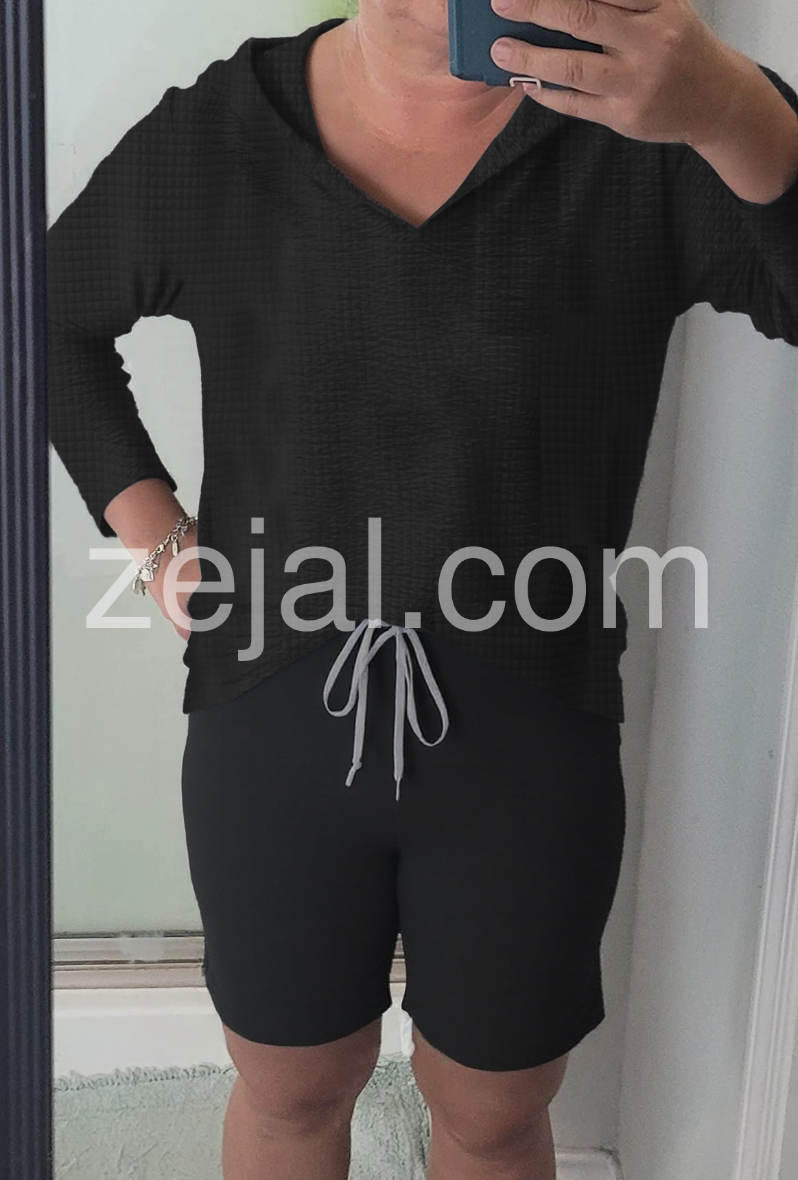 This two-piece set is so comfortable and stylish. The black hoodie is perfect for casual days, and the shorts are great for lounging or running errands.