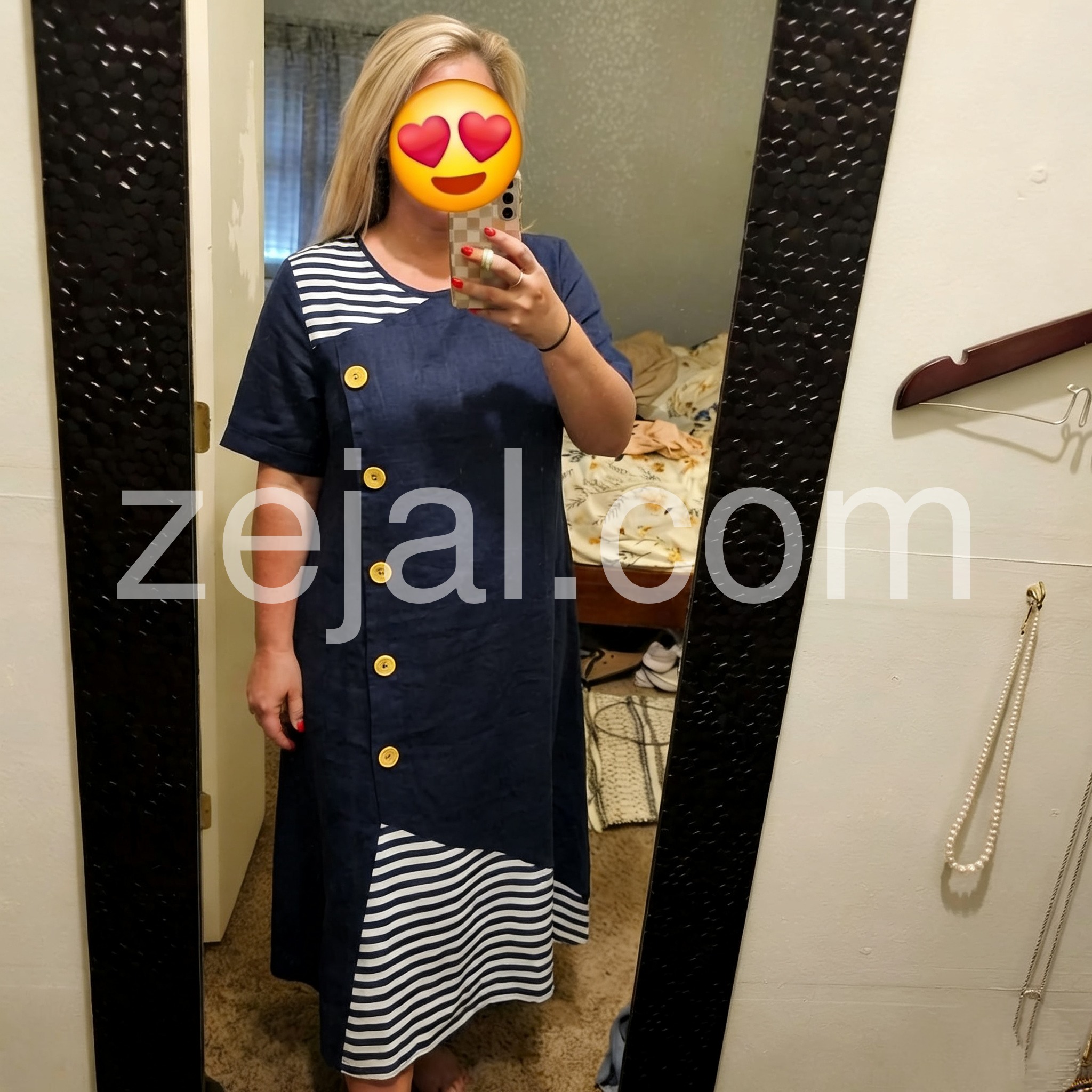 I bought this dress for a Mediterranean cruise and it was perfect! The linen-like fabric kept me cool in the hot sun, and the nautical navy and white stripes fit the vibe flawlessly. Fits true to size.