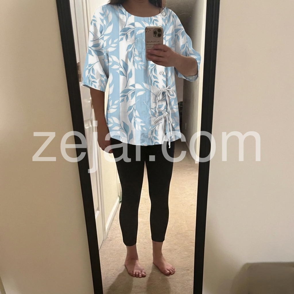 Thisloose-fitting topfeatures a soft blue and white leaf pattern with vertical stripes. The front button closure and side tie add a stylish touch. Made from lightweight fabric perfect for warm days. Pair with jeans or pants for a casual, breezy look. Comfortable and effortlessly chic.