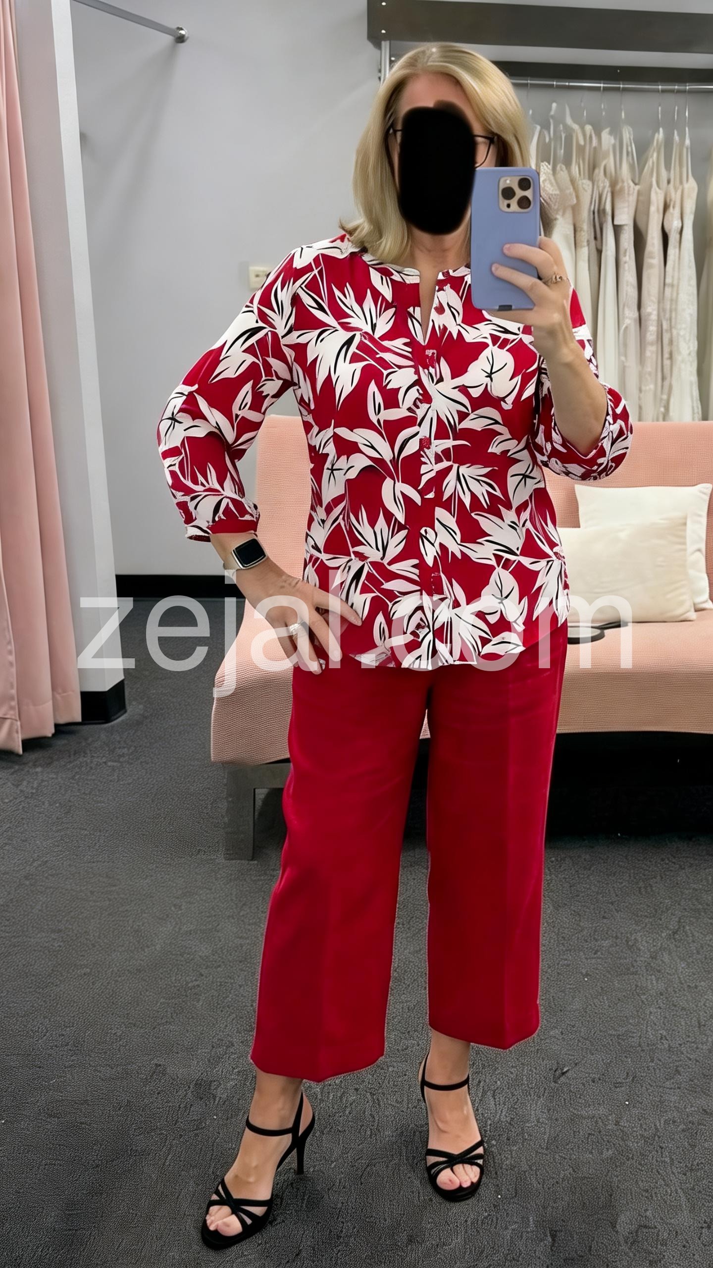 This coordinated set features a vibrant red blouse with white leaf print and button-front detail. Paired with matching cropped pants for a polished look. The three-quarter sleeves add a touch of elegance. Perfect for casual outings or warm-weather events. Confident, chic, and easy to wear.