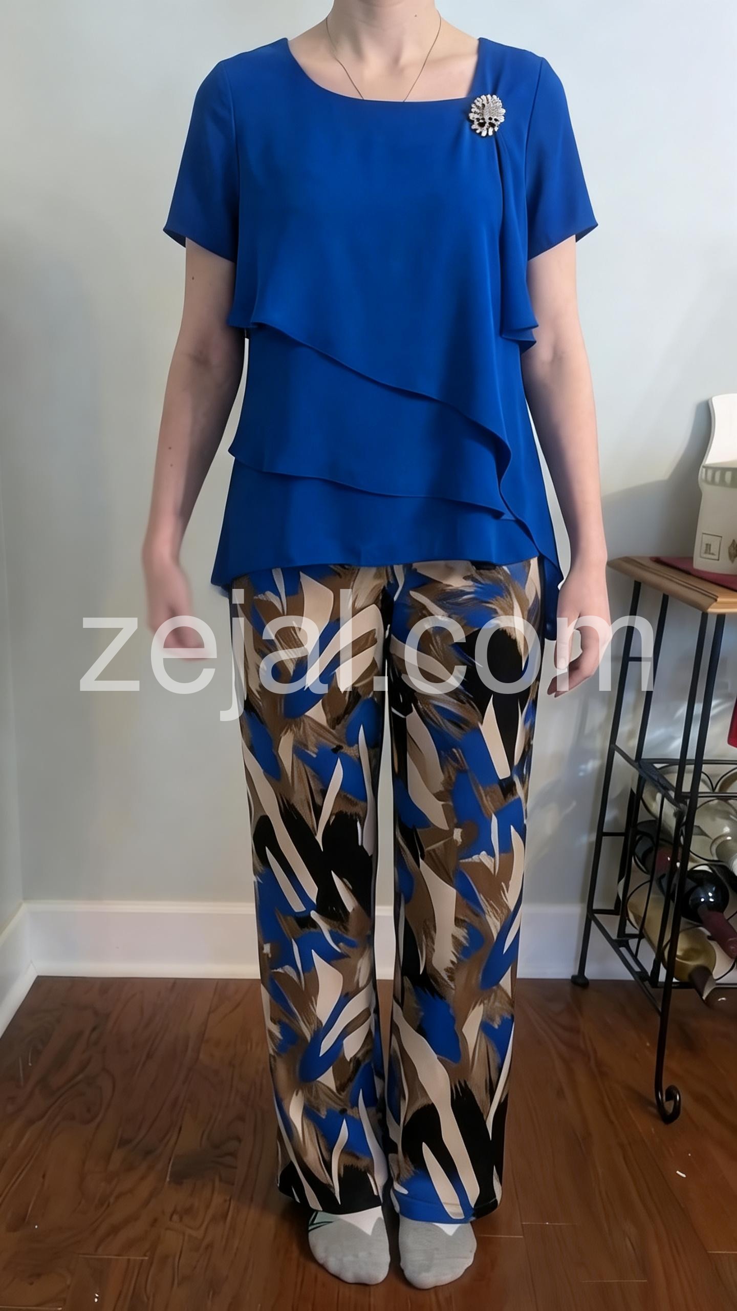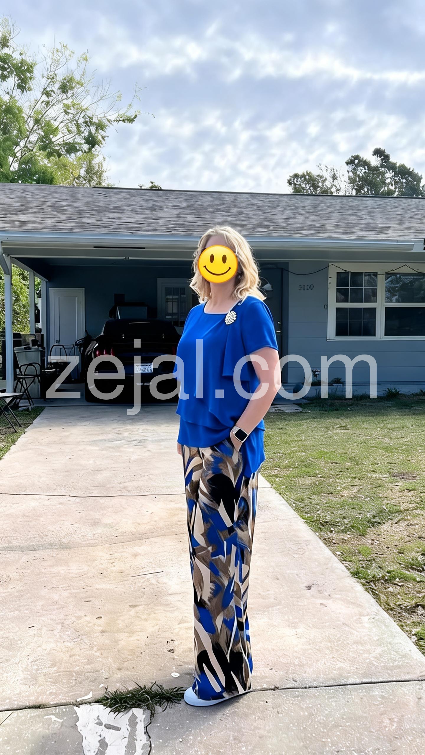 Thiscoordinated setfeatures a vibrant blue top with an asymmetrical layered hem and matching wide-leg pants in a bold abstract print. The combination of solid and patterned pieces creates a stylish contrast. Lightweight fabric perfect for warm weather. Ideal for casual outings or relaxed elegance. Effortlessly chic and fashion-forward.