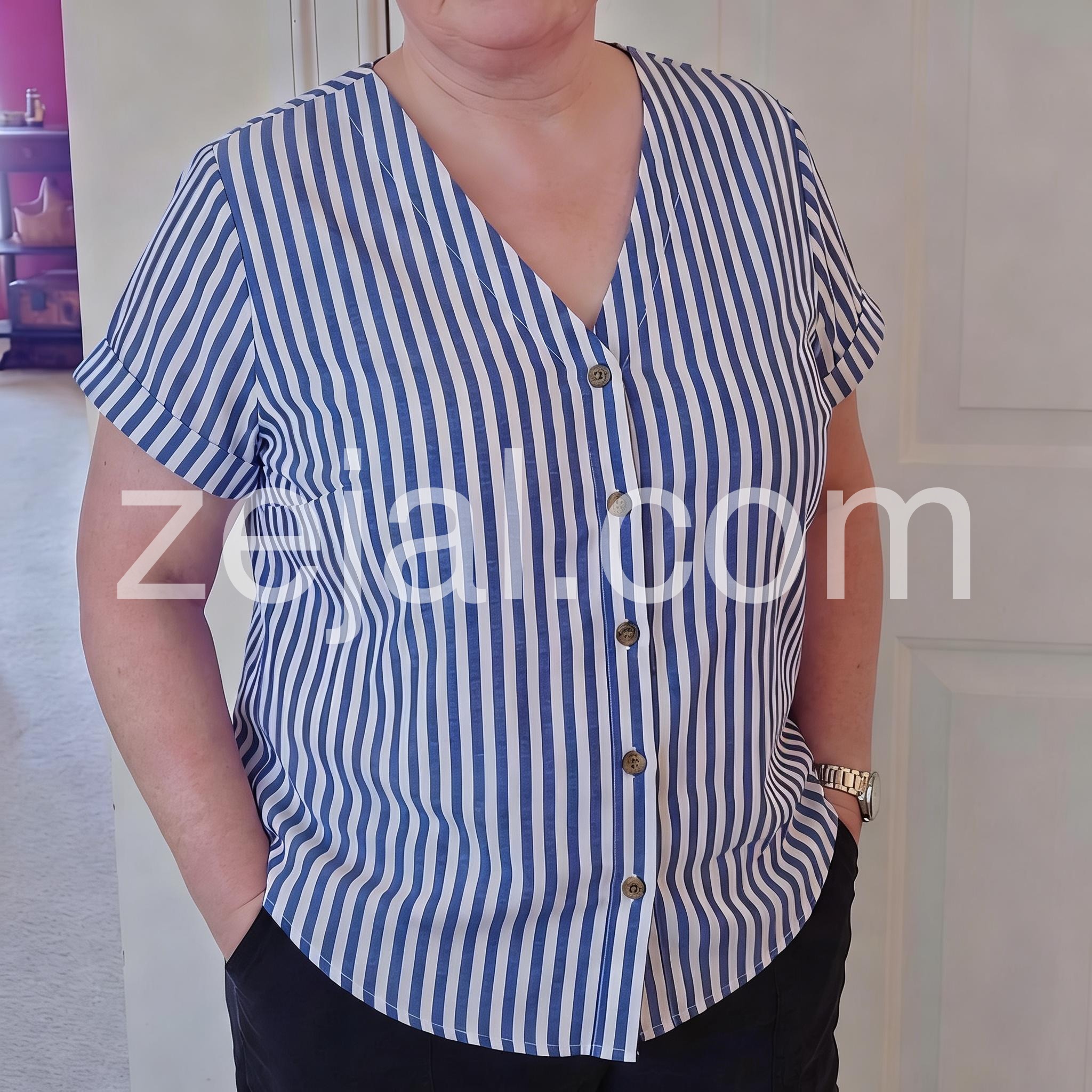 I am very happy with this blouse. It's very rare for me that clothing purchased online fits well and is of good quality. And this is one of those cases. High-quality fabric. A wonderful stripe blue color. And a loose silhouette with correct sizing. I am very pleased with my purchase.