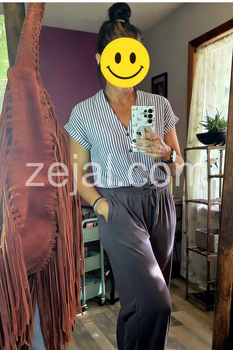 I absolutely love this striped blouse! The vertical lines are so flattering and slimming. The material is lightweight, making it perfect for summer weather. I paired it with jeans just like the model and it looks so effortlessly chic.