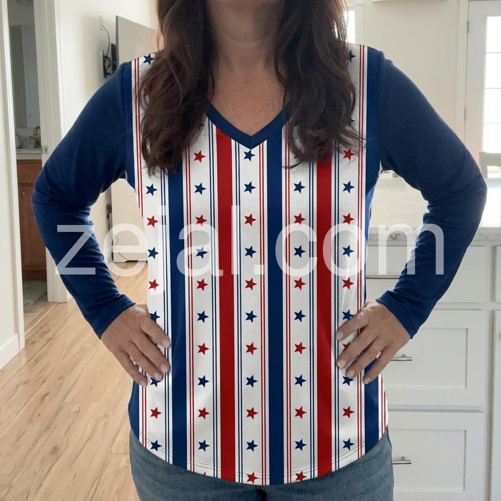 Blue Patriotic Stars and Stripes V-Neck Long Sleeve Top