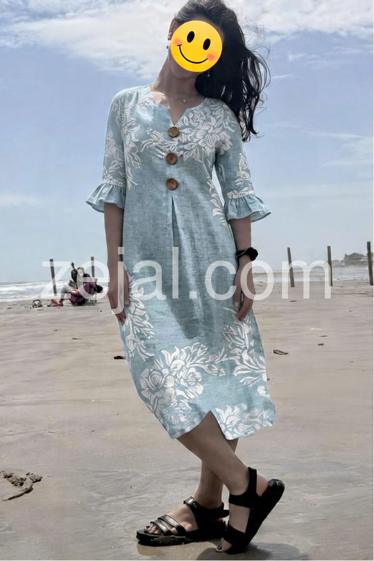 Blue Floral Ruffle Sleeve Button Linen Maxi Dress