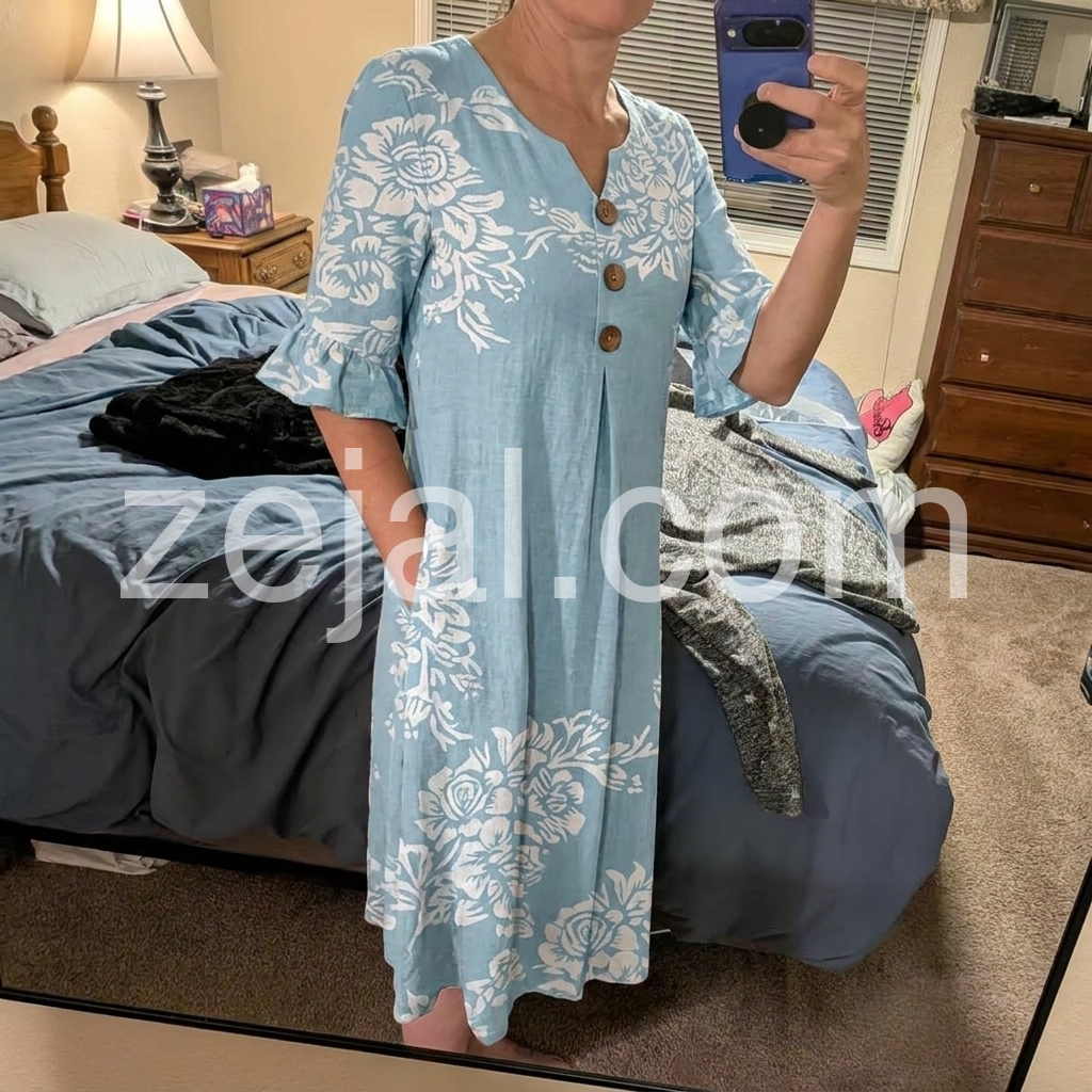 This dress is incredibly flattering! The V-neck and buttons draw the eye down, and the relaxed fit hides all my problem areas. It is lightweight enough for summer but you could easily pair it with a denim jacket for spring. Very satisfied with my purchase.