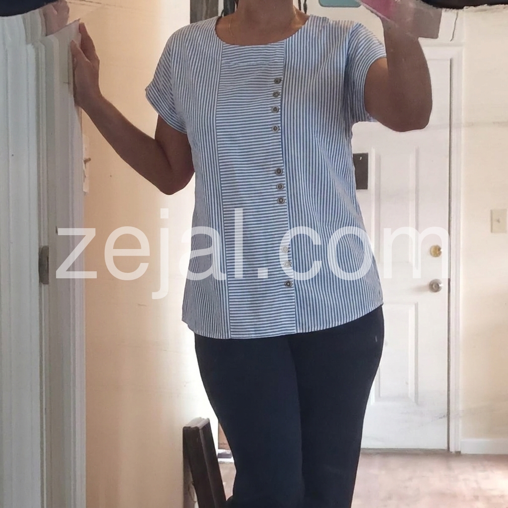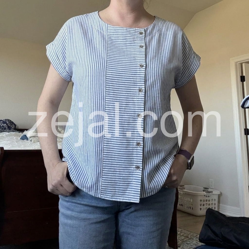 I designed this blouse to fix the "ill-fitting striped top" pain point. The vertical stripe panel slims the torso, while the side buttons add a modern twist to a classic design.