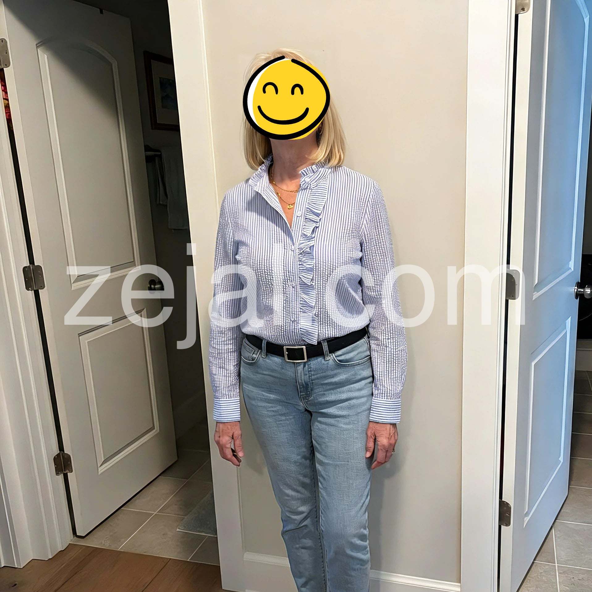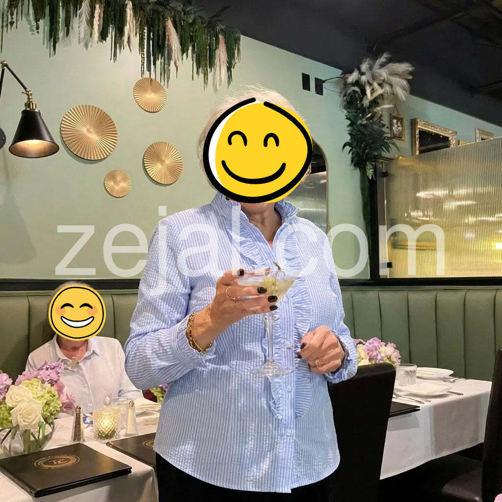 I wore this shirt for a casual brunch and felt effortlessly put-together. The light blue and white stripes are crisp, and the ruffle trim brings a soft romantic touch. The fabric has a comfortable weight, not too sheer, and the cuffs are just the right length for rolling up on warmer days.