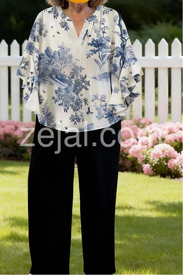 I'm impressed by how the blouse drapes; the ruffled sleeves bring a playful element while staying classy. It would pair nicely with white jeans or a tailored skirt.