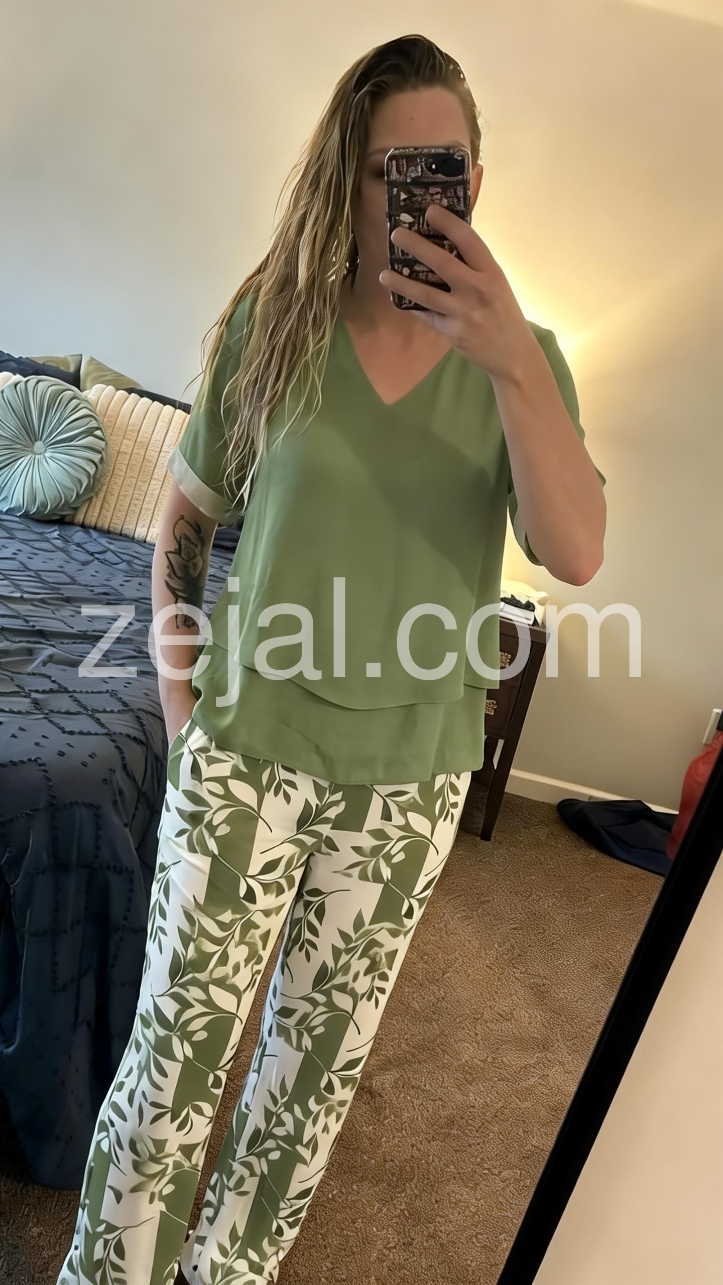 Thiscoordinated set features a solid green V-neck top with a layered hem and rolled sleeves. Paired with white pants in a leafy green pattern for a natural, airy look. Lightweight fabric perfect for casual wear. Ideal for everyday comfort or light outings. Effortlessly stylish and easy to wear.