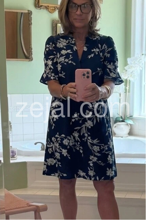Enjoy effortless elegance with this navy floral dress. It features delicate white blooms and flared 3/4 sleeves, adding a romantic touch to the classic shift style.