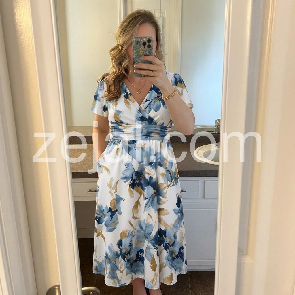 true to size (medium for me- 5’4” 150lbs) and comfortable. I am very pleased with this A line pleated flare dress. The cut is flattering and the overall construction feels well done. I ordered a size medium as I am normally an 8/10 and the medium worked well. One thing I especially appreciate is that it is modest while still looking polished. It feels like a complete outfit all on its own, which makes getting dressed simple. I am very happy with it and would recommend it.
