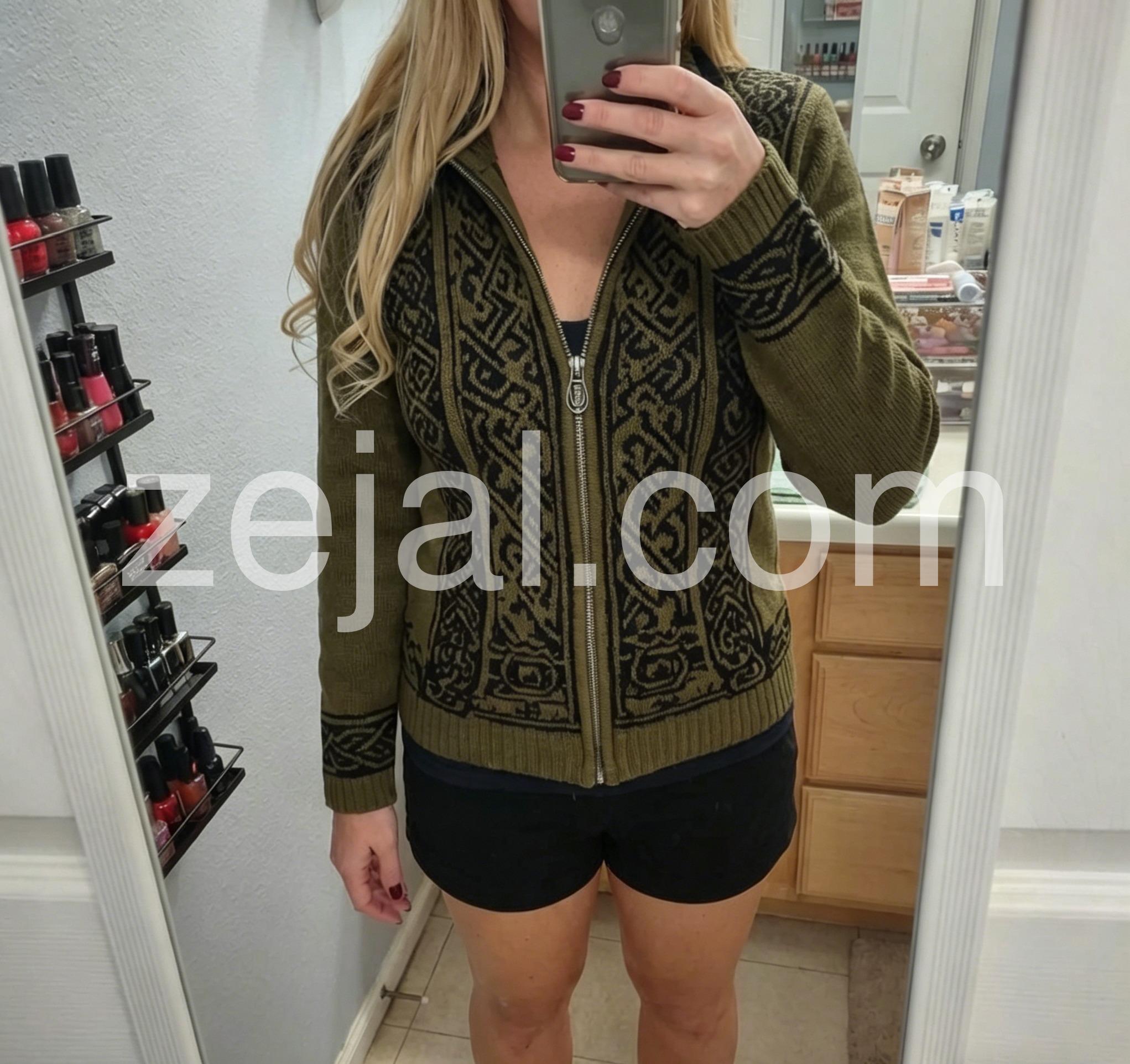 This olive green Celtic-pattern zip-up cardigan is such a standout piece! The thick, cozy knit is warm enough for crisp fall days, and the intricate black tribal-inspired pattern gives it such a cool, edgy vibe. The full-zip front makes it easy to layer, and the ribbed cuffs and hem keep the fit snug. I love pairing it with jeans and boots for a boho-rock look, and it gets compliments every time I wear it. The fabric is soft, durable, and holds its shape perfectly after washes.