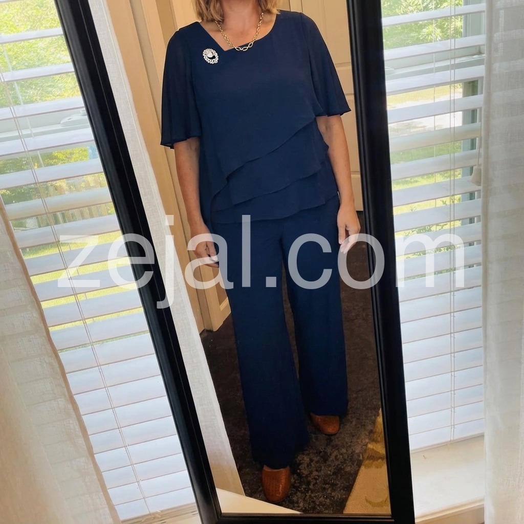 This outfit is a lifesaver. I am not a dress person, so finding something formal enough for an evening gala was stressing me out. This pant suit looks just as dressy as a gown. The navy color is deep and rich. It fits true to size and the chiffon overlay is gorgeous.