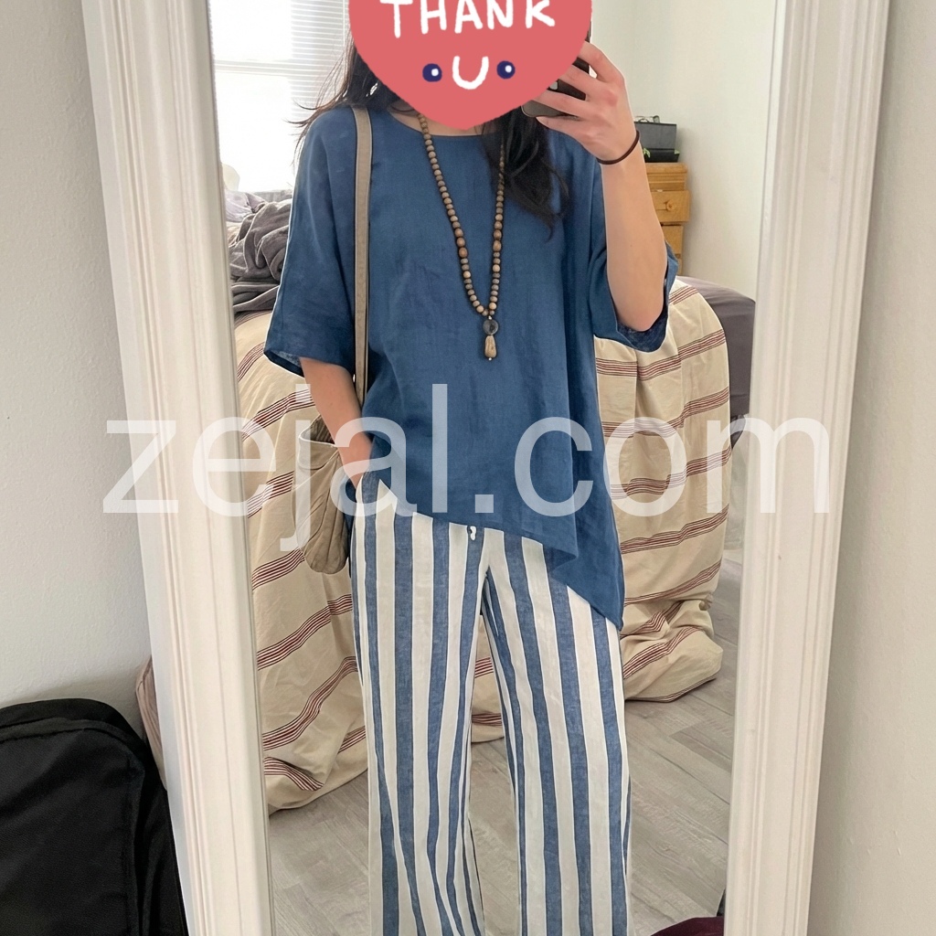 This relaxed outfit features a navy asymmetrical tunic with a flowing silhouette. Paired with wide-leg pants in bold blue and white stripes. Lightweight fabric perfect for warm days. Ideal for casual outings or beachwear. Effortlessly stylish and comfortable.