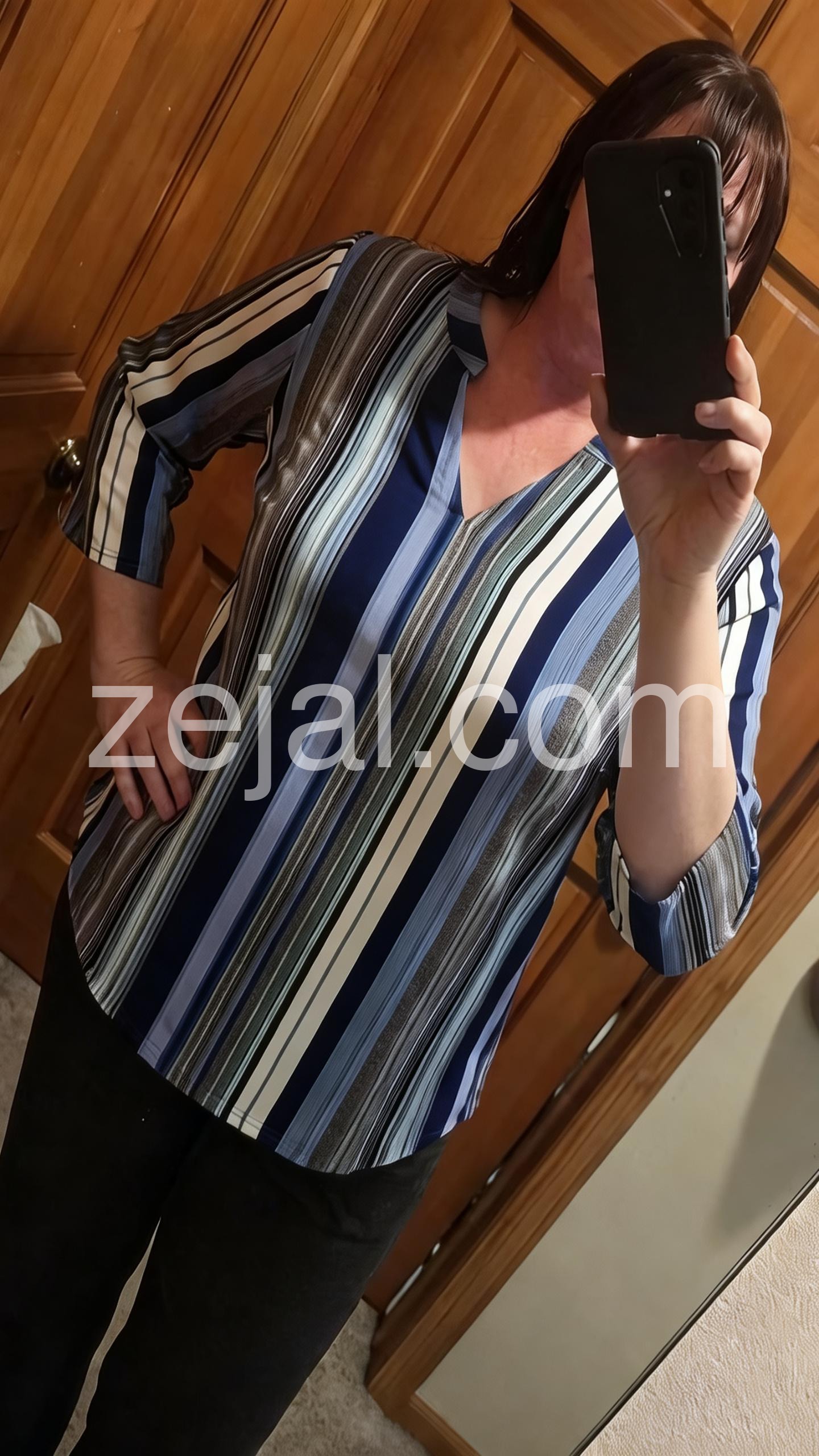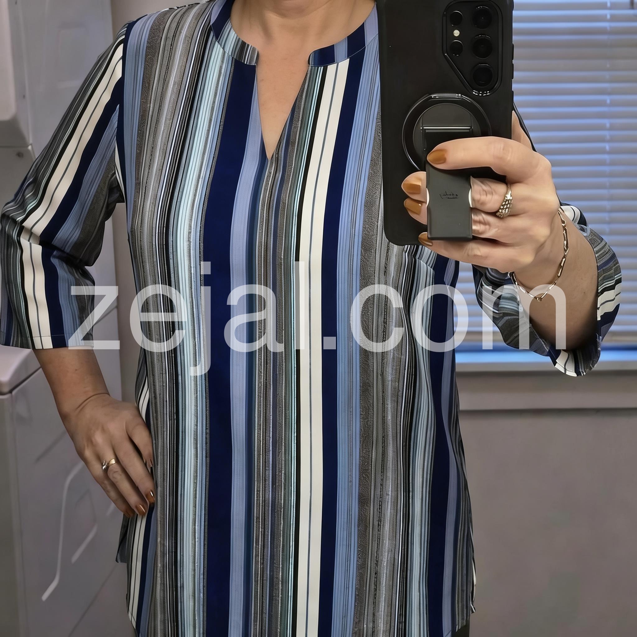 This loose-fitting top features vertical stripes in navy, blue, white, and gray for a modern look. The V-neck design adds a touch of elegance. Three-quarter sleeves with rolled cuffs offer comfort and style. Perfect for pairing with jeans or pants. Effortlessly chic for everyday wear.