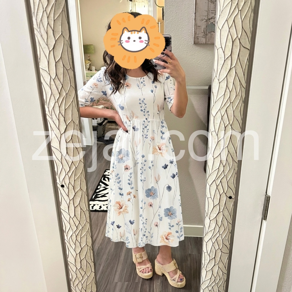 This is the perfect summer dress. The floral print is delicate and exactly as pictured. I appreciate the modest half sleeves and the midi length, which make it great for church or a casual brunch. Fits true to size.