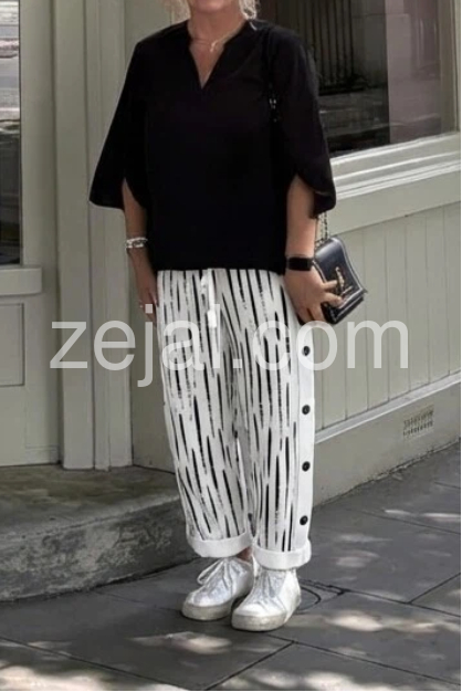 These pants are absolutely amazing! The black and white brushstroke pattern is so chic, and the elastic waist makes them incredibly comfortable for all-day wear. I love the side button details, it adds such a unique touch. Highly recommend for a stylish summer outfit!