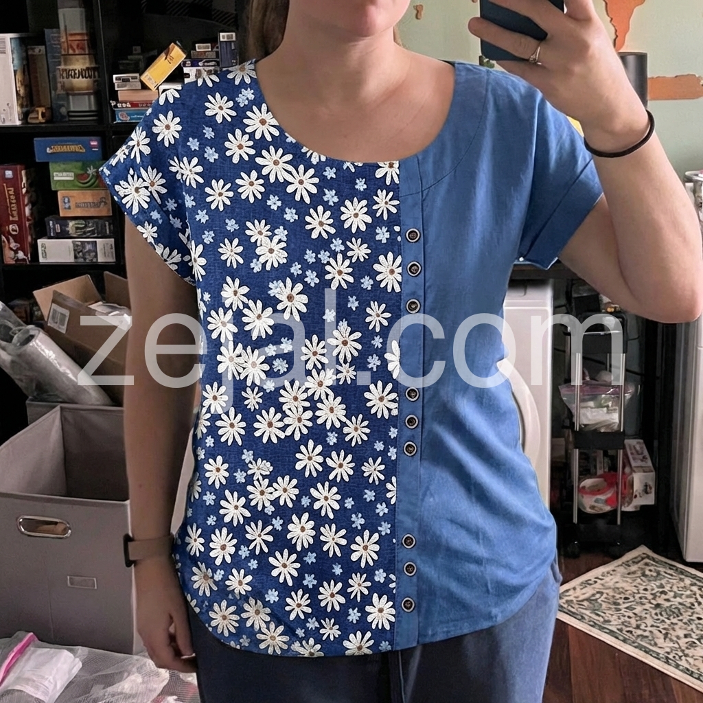 This blouse was designed to solve the “I want something cute but not over-the-top” dilemma. The daisy print on one side and solid blue on the other creates a unique color-block effect that feels fresh and modern.