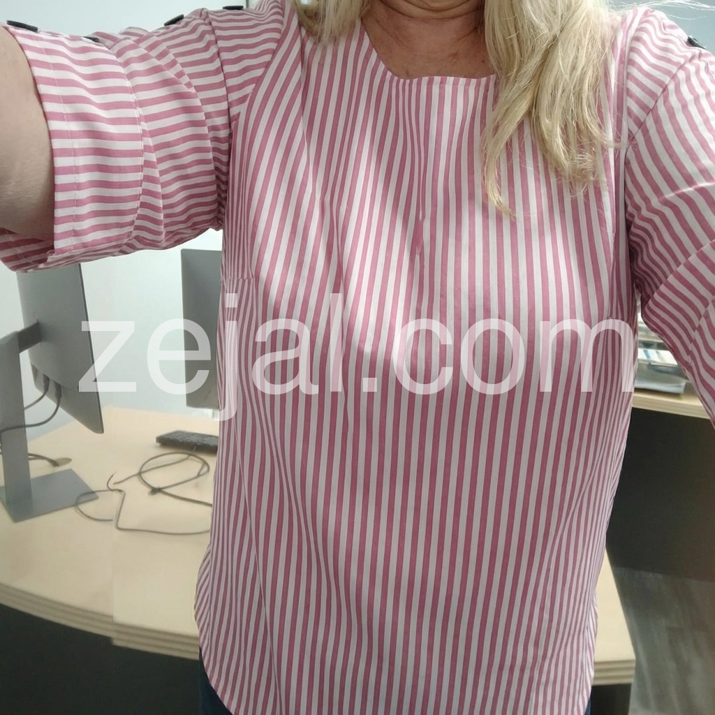 his loose-fit top features vertical pink and white stripes with stylish button details on the sleeves. Three-quarter sleeves with rolled cuffs offer a relaxed look. Round neckline for a clean, comfortable fit. Perfect for casual wear or smart-casual outfits. Bright and cheerful with a touch of elegance.