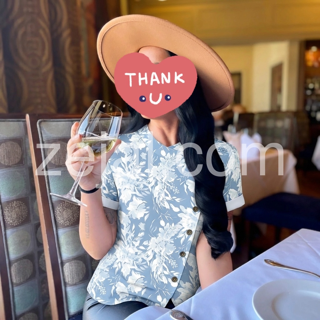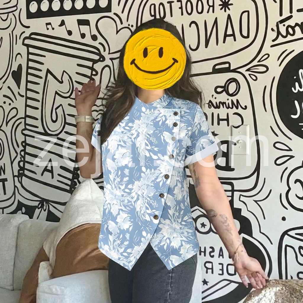 This blouse reimagines romantic floral motifs with modern, architectural tailoring. The soft sky-blue base, printed with delicate watercolor-style white florals, evokes a gentle, feminine sensibility.