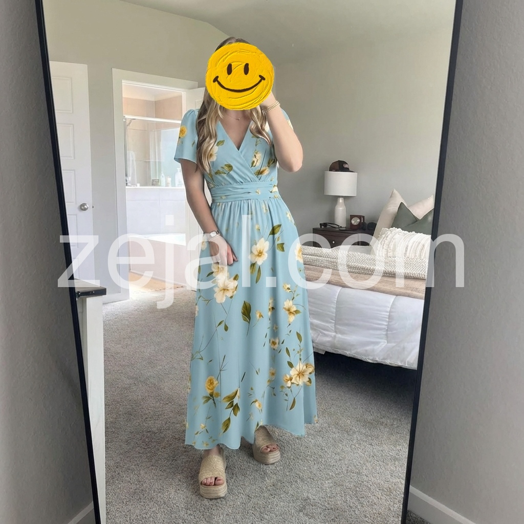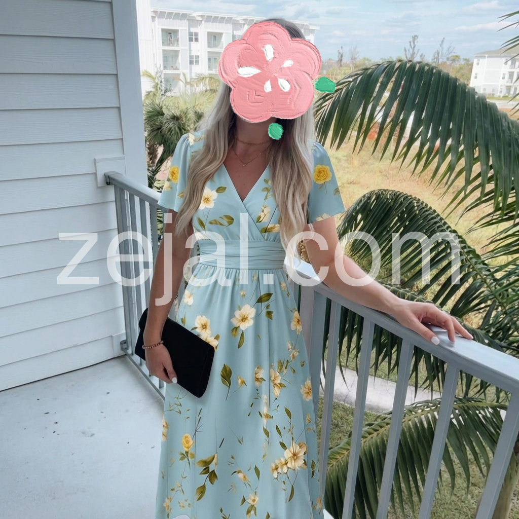 I absolutely love this dress! The light blue color is stunning and the floral pattern is perfect for spring and summer. The cinched waist is incredibly flattering, and the v-neck is just the right depth. I wore it to a garden party and received so many compliments. Highly recommend!