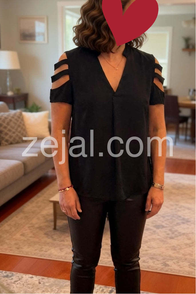 Absolutely love this top! The strappy cutout sleeves add just the right amount of edge while keeping it classy. It drapes beautifully and is so comfortable. Highly recommend!