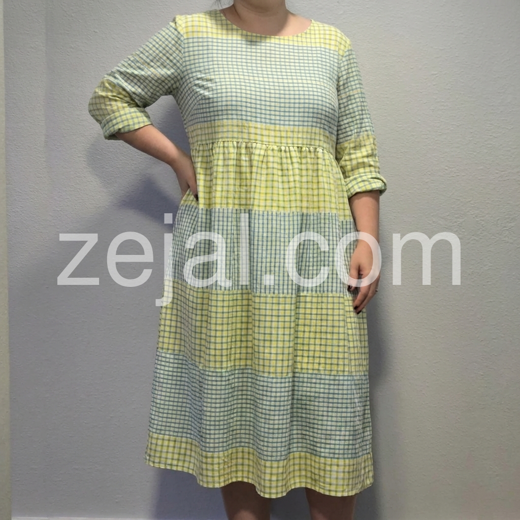 This midi dress celebrates effortless summer style with a playful color-block gingham design. The round neck, 3/4 sleeves, and tiered skirt offer a relaxed, flowy fit.