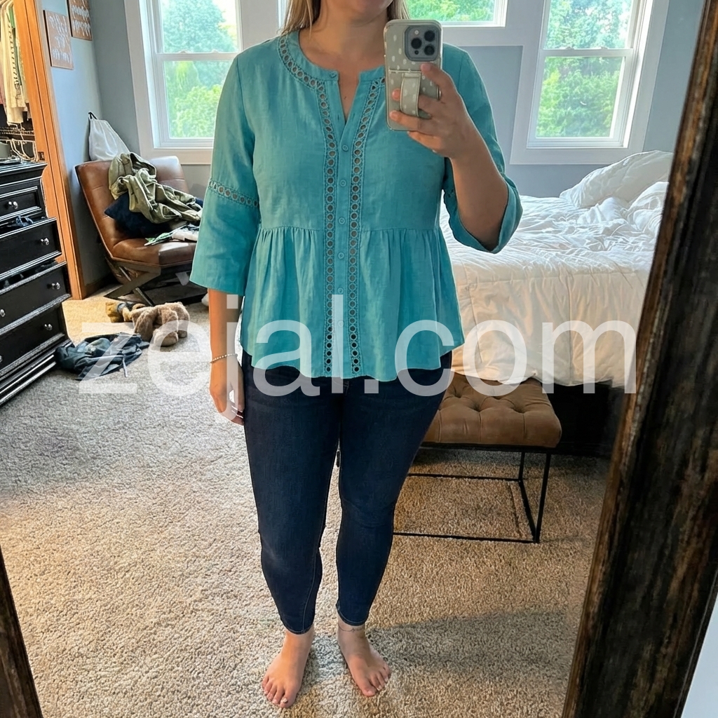 This loose-fit top features a vibrant teal hue with delicate eyelet cutouts along the neckline and sleeves. Button-down front and flared hem add a feminine touch. Three-quarter sleeves offer comfort and style. Lightweight fabric perfect for warm weather. Effortlessly chic with a relaxed, bohemian vibe.