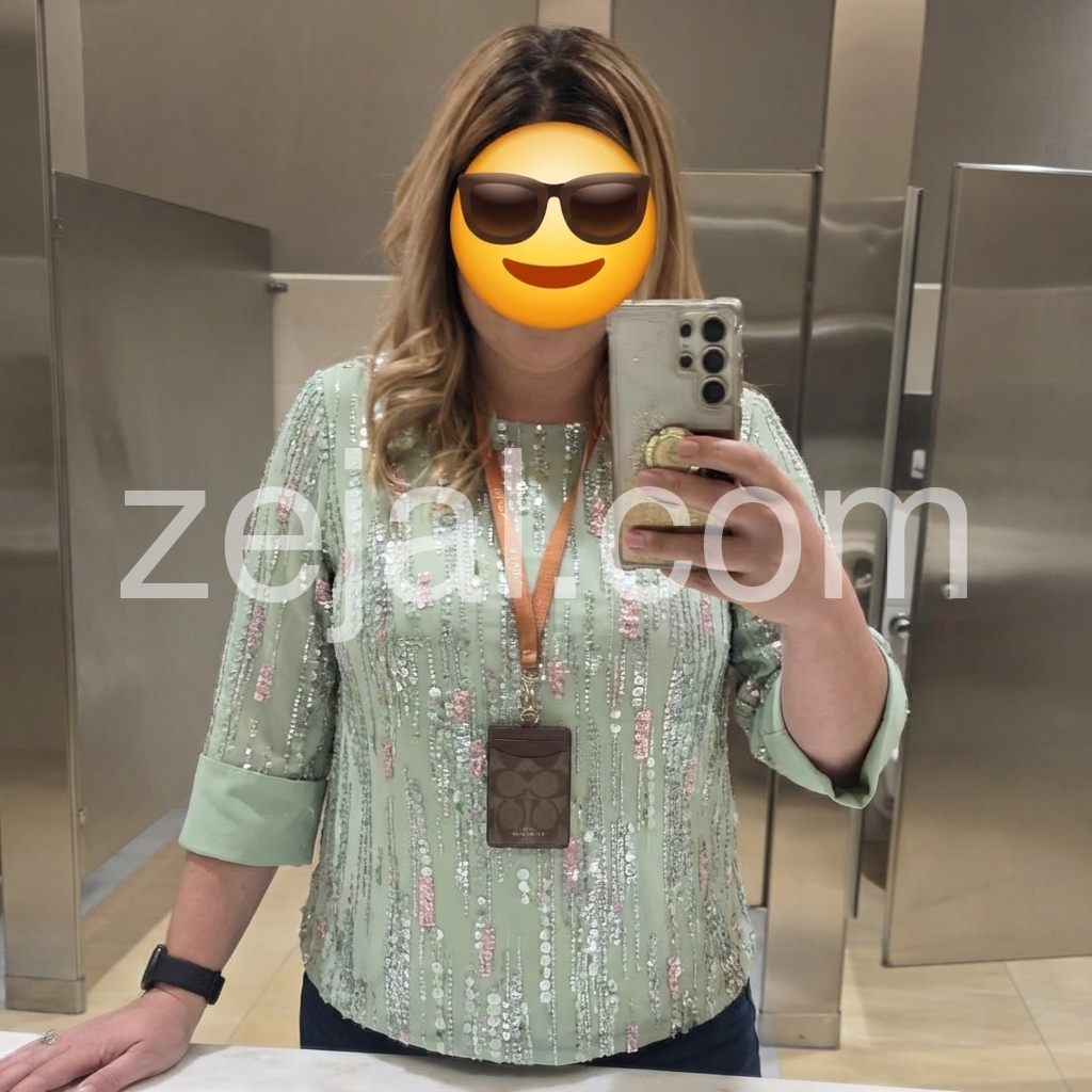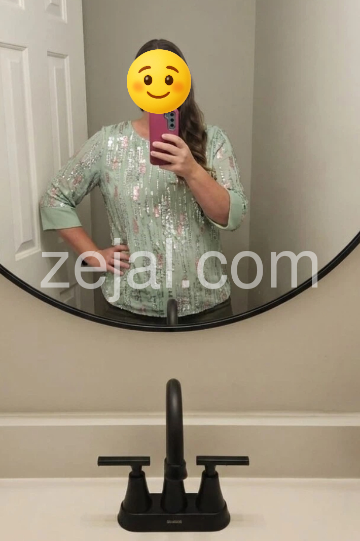This top is absolutely stunning! The mint green color is so refreshing, and the sequins add just the right amount of sparkle without being overwhelming. Perfect for my upcoming holiday party. Fit is true to size.