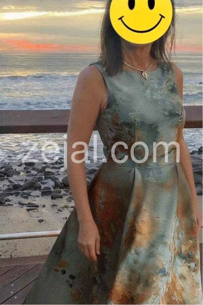 This stunning sleeveless midi dress features a bold abstract print with a harmonious blend of soft blue, earthy rust, and muted gold tones, reminiscent of a watercolor masterpiece. Crafted from luxurious, structured fabric, the dress boasts a flattering high-neck design and a tailored fit through the bodice that elegantly flares into an A-line skirt, creating a graceful silhouette. The mid-calf length adds timeless sophistication, making it perfect for cocktail parties, weddings, or upscale evening events. Paired with delicate heels and a sleek clutch, this dress exudes refined elegance and artistic flair—ideal for those who appreciate fashion with a touch of modern artistry.