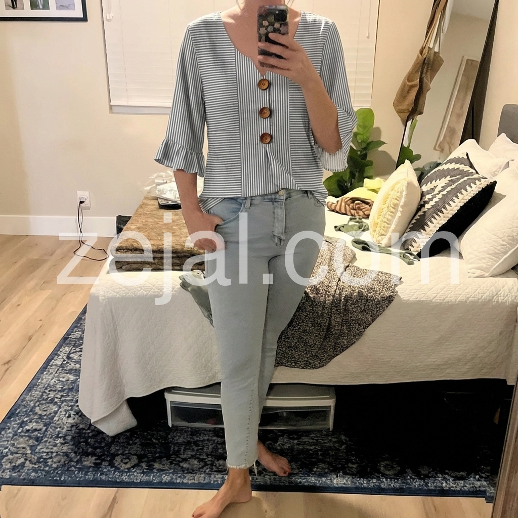 This blouse was created to solve the “boring striped top” problem. The classic grey stripes are updated with a notched V-neck and ruffled three-quarter sleeves, adding feminine charm without being overly frilly.
