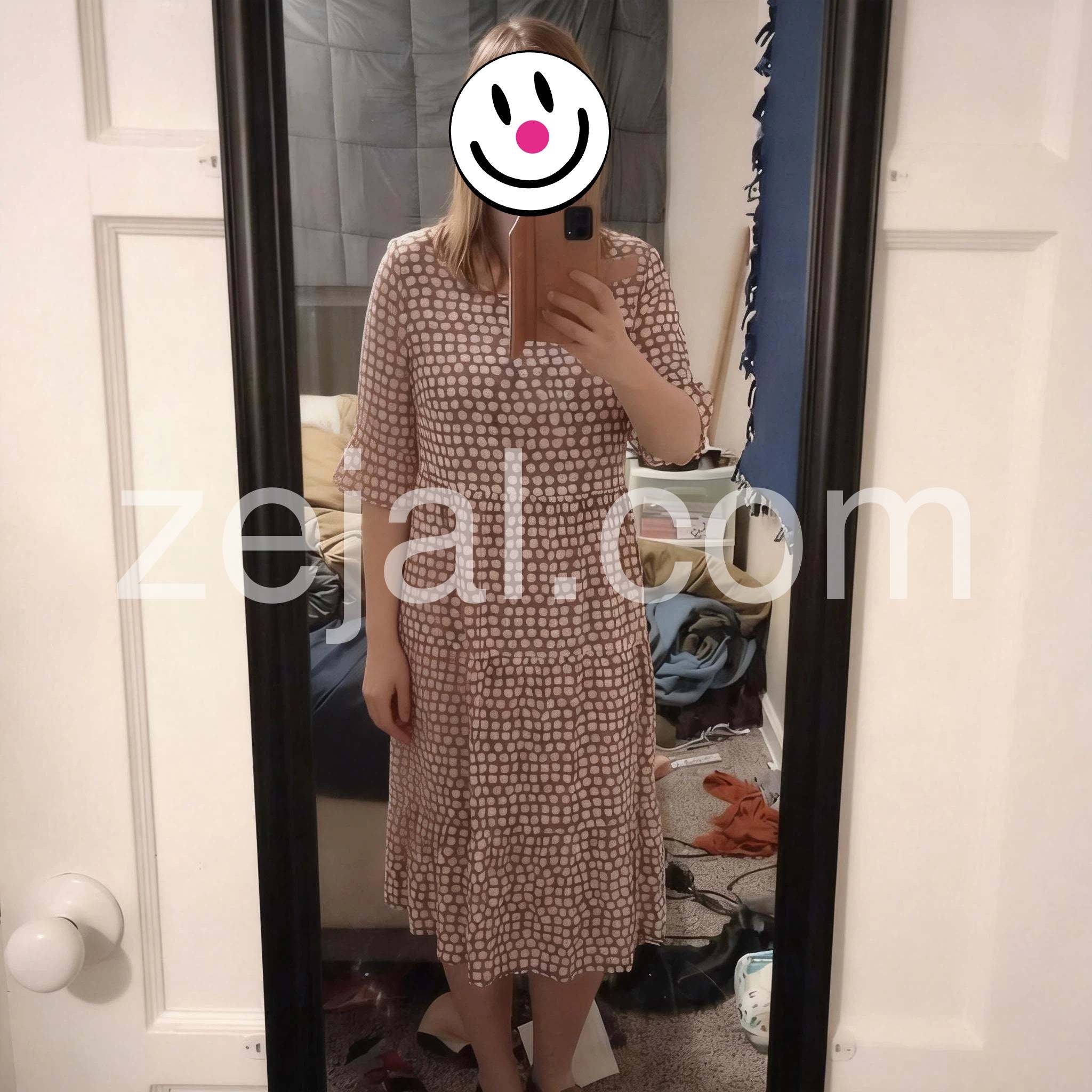 Beautiful dress! It is very flowy and hides the tummy area perfectly. The smock style is incredibly forgiving and I just love the neutral brown and white colors.