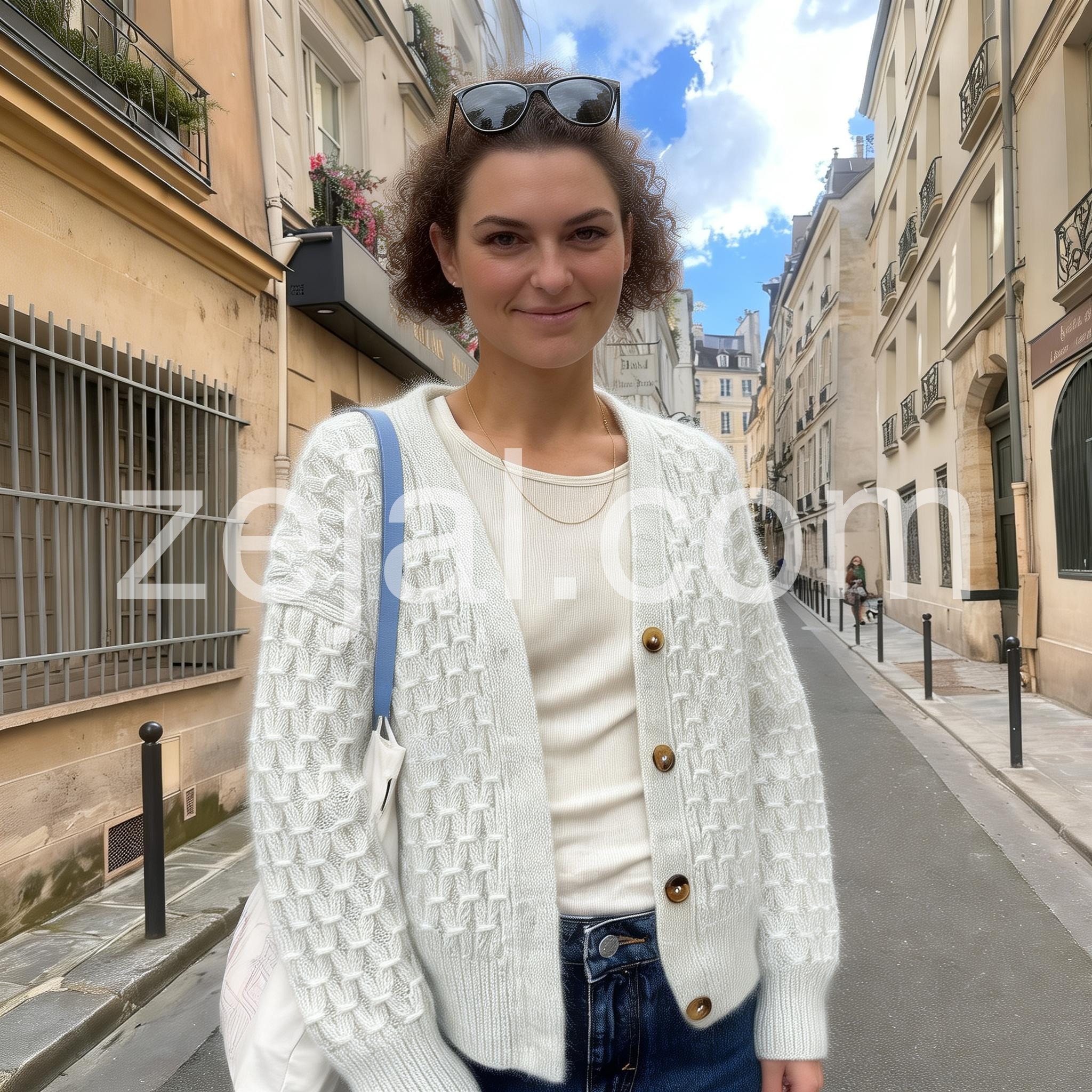 I am obsessed with the buttons on this cardigan! They contrast beautifully with the light yarn. I find myself reaching for this piece almost every morning. Great everyday sweater.