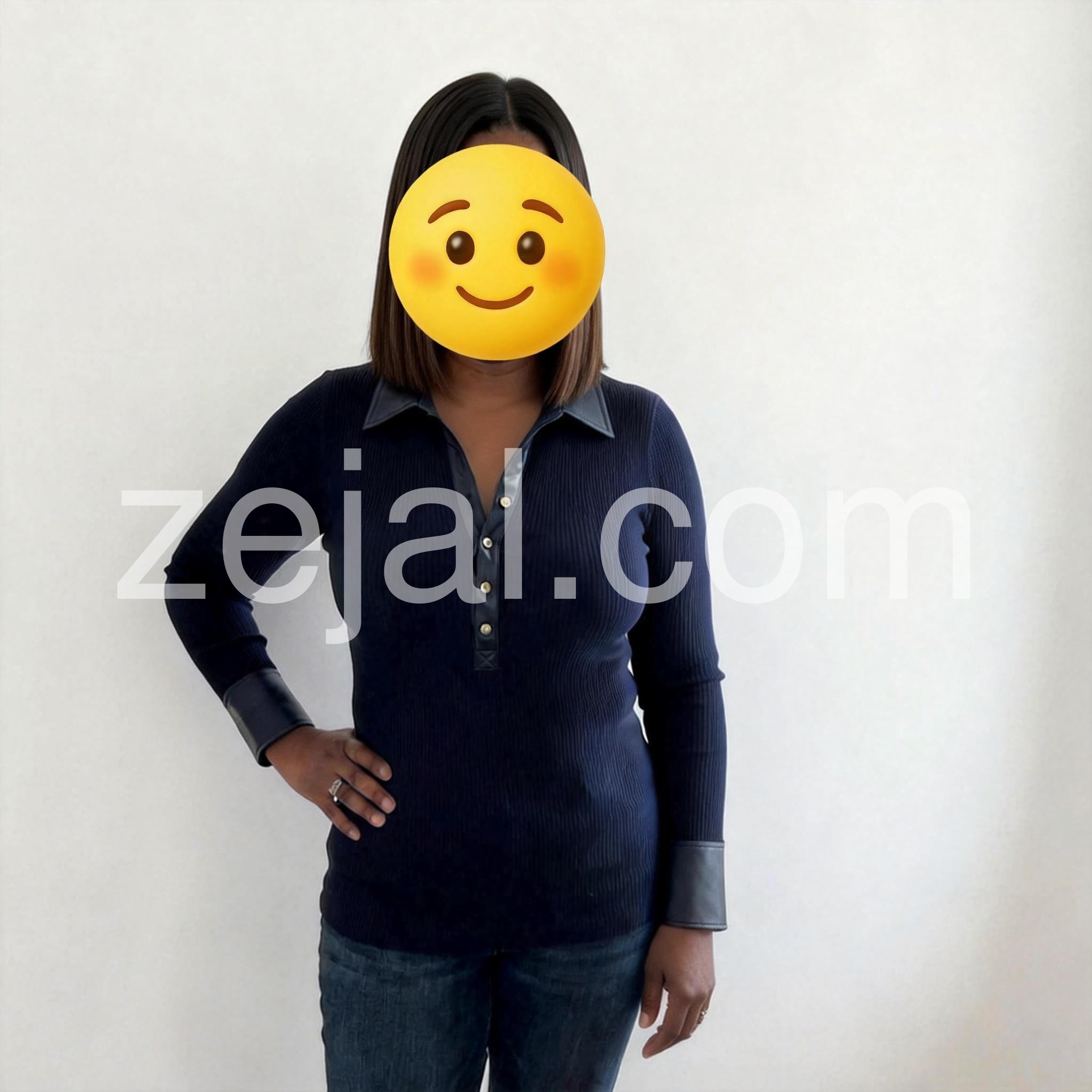 This navy ribbed top with the contrast trim is stunning--the gold buttons add just the right touch of sophistication, and the curved fit is incredibly flattering. Paired perfectly with distressed jeans for a chic, casual vibe.