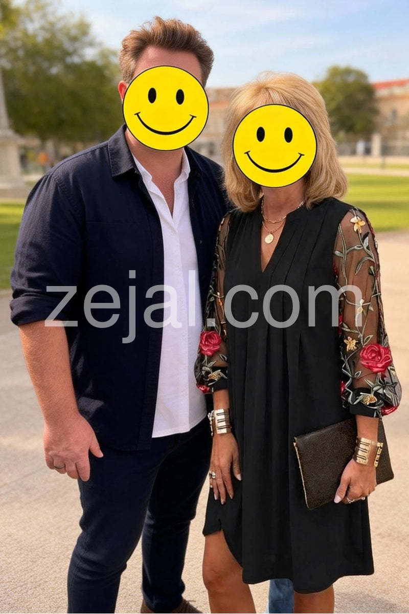 Beautiful dress! I was worried the mesh sleeves might be itchy, but they are incredibly soft and comfortable. The embroidery is stunning in person, with vibrant red roses that really pop. It drapes beautifully and hides my tummy area perfectly.