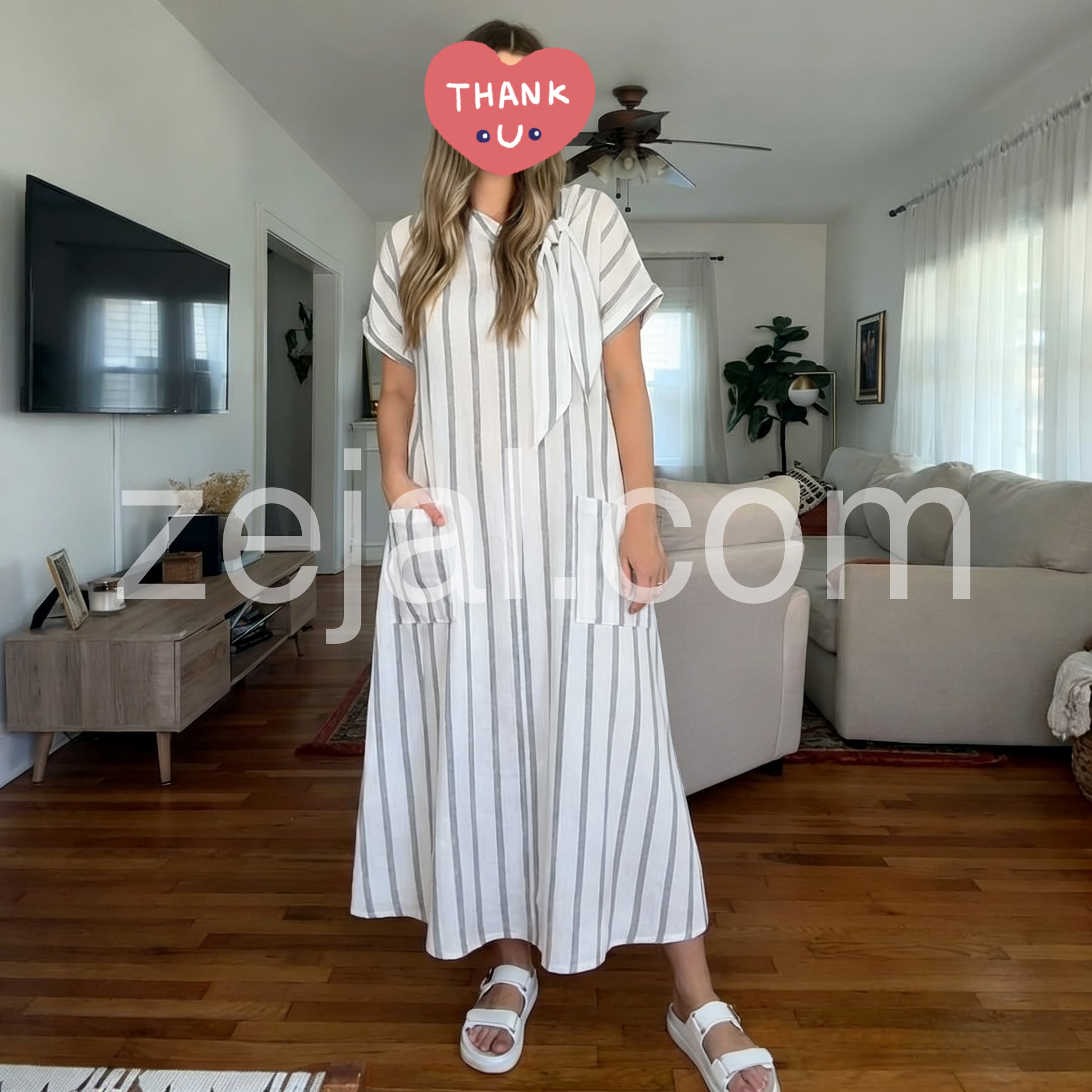 The classic vertical stripe print, twisted neck detail, and oversized pockets create a relaxed, stylish silhouette.