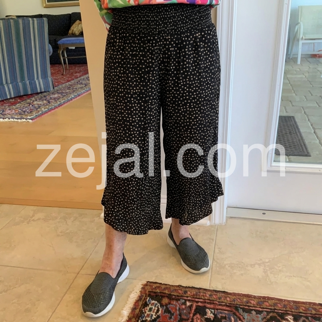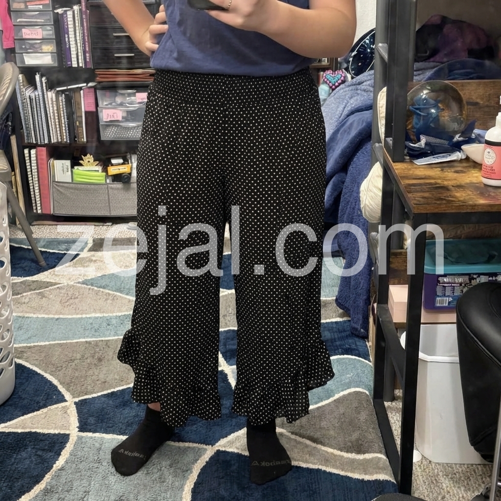 These high-waisted culottes feature a black base with tiny white polka dots. Wide-leg design with ruffled hem for a soft, flared look. Lightweight fabric perfect for warm weather. Ideal for casual outings or relaxed styles. Comfortable and effortlessly chic.