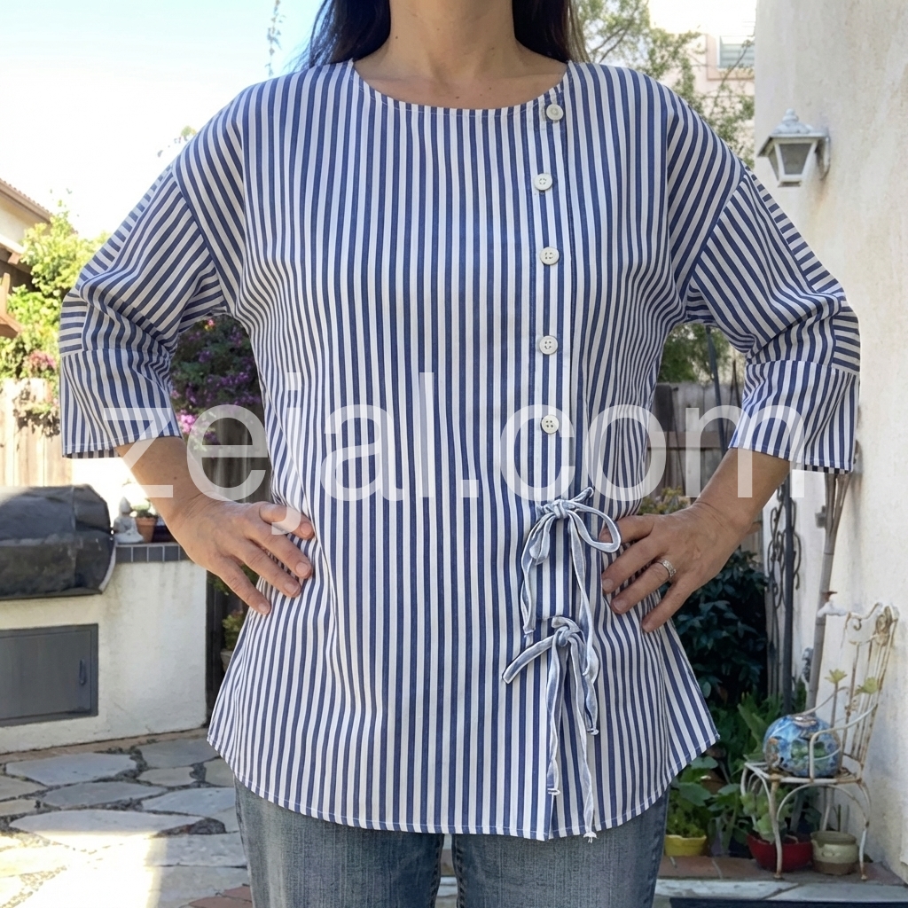 This loose-fit top features vertical blue and white stripes with a clean, casual look. Round neckline and front button-down design for easy wear. Side ties add a feminine touch. Three-quarter sleeves with rolled cuffs. Perfect for everyday comfort and effortless style.