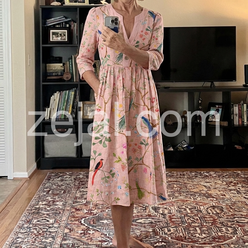 This three-quarter sleeve dress features a soft pink base with colorful birds and floral patterns. The V-neck and button front add vintage appeal. Side pockets offer comfort and convenience. Lightweight fabric perfect for spring and summer. Ideal for casual outings or garden parties.
