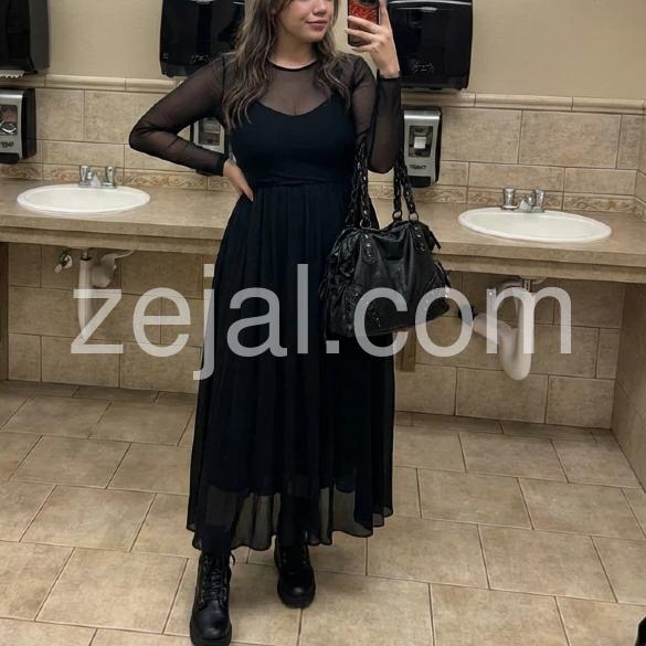 Absolutely in love with this dress! The sheer mesh sleeves give it such a cool, edgy vibe without being too revealing. I wore it to a concert with chunky combat boots just like the model, and it looked incredible. The material is surprisingly soft and flows beautifully when you walk.