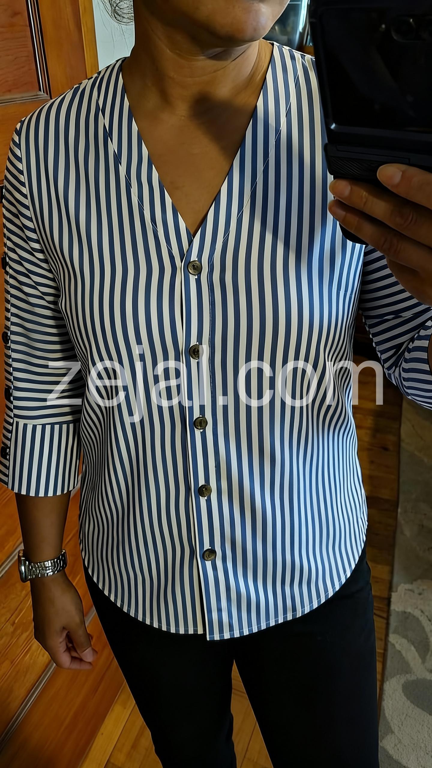This V-neck blouse features bold vertical blue and white stripes with a front button closure. The three-quarter sleeves have decorative side buttons for added detail. Lightweight fabric perfect for everyday wear. Pair with jeans or trousers for a polished look. Ideal for casual or office settings.