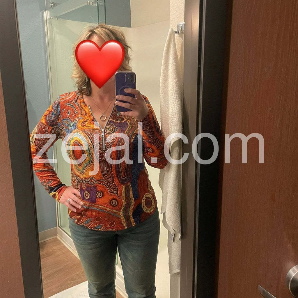 Zip it up with this autumn color casual top, featuring red, orange, blue, and yellow geometric swirls and bead print patterns. The long fitted sleeves, zippered plunging v-neckline, and waist-length silhouette give this laid-back top just the right amount of detail. Finish your look with silver or gold jewelry, jeans, and a cami underneath. Machine wash cold tumble dry low to mediumheat. Iron if needed or lay flat to dry.