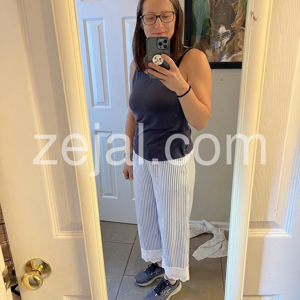 These relaxed-fit pants feature vertical blue and white stripes with a delicate lace trim at the hem. Elastic waistband and side pockets for comfort. Lightweight fabric perfect for warm weather. Ideal for beach days or casual outings. Effortlessly stylish and breezy.