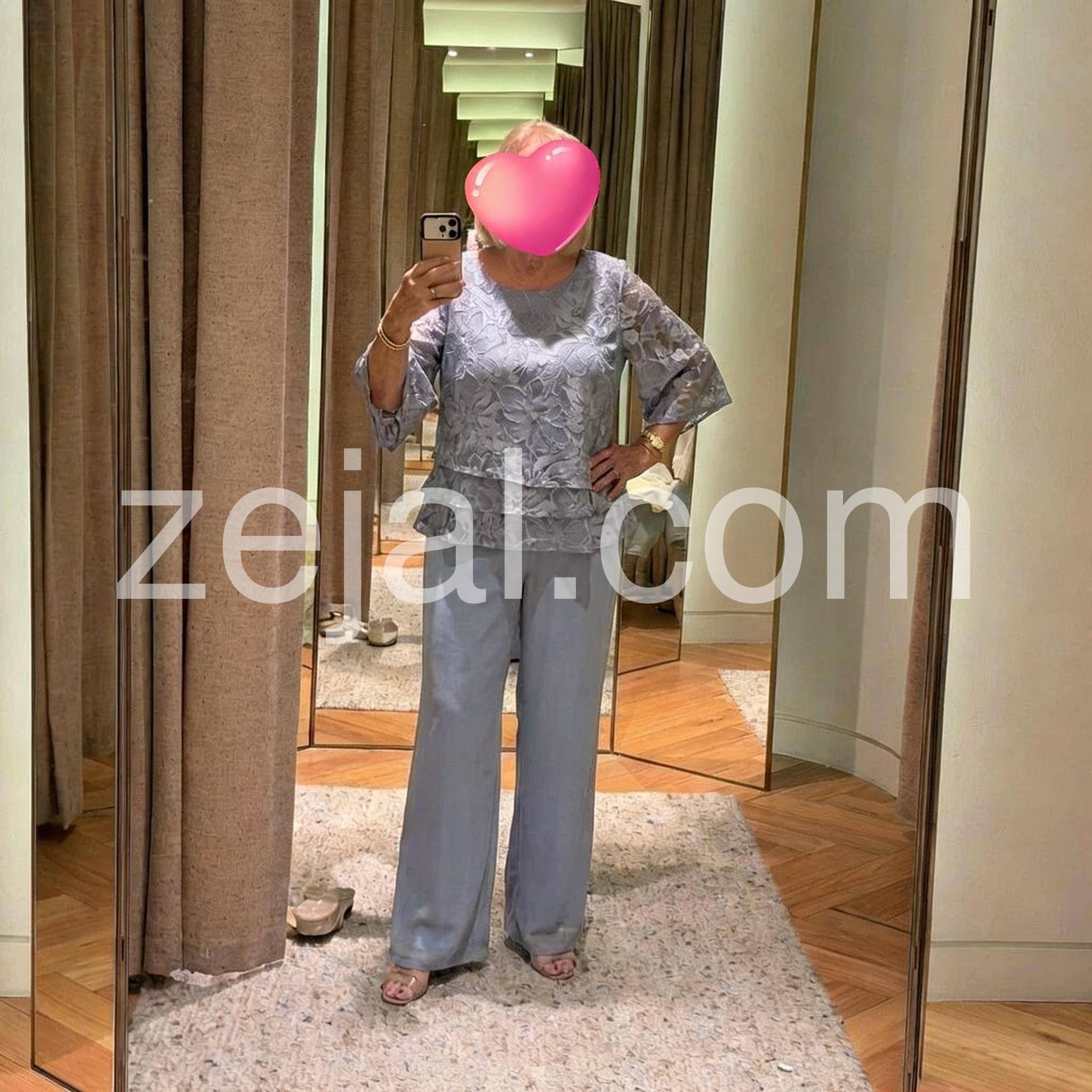 Elegant and timeless. The pale blue suit drapes beautifully, and the matching pants are roomy without looking sloppy. Great for weddings, luncheons, or work events. The fabric feels breathable and moves well all day.