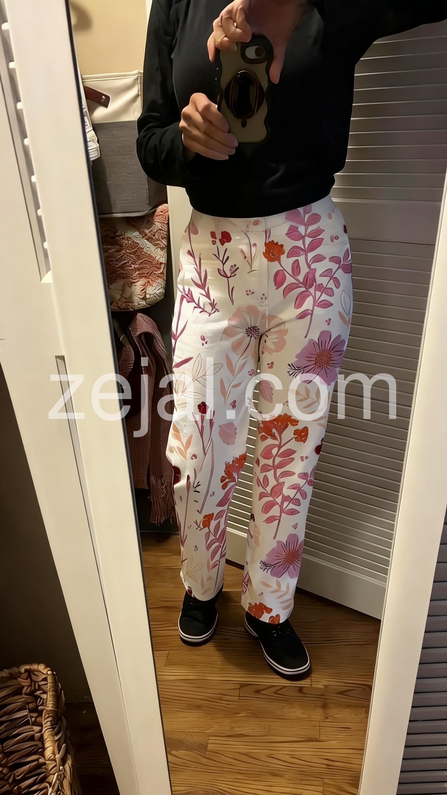 These loose-fit pants feature a vibrant floral pattern in soft pinks, purples, and oranges on a white base. Elastic waistband with side pockets for comfort. Wide-leg design with a relaxed, flowing silhouette. Perfect for casual wear or garden outings. Lightweight fabric ideal for warm days.