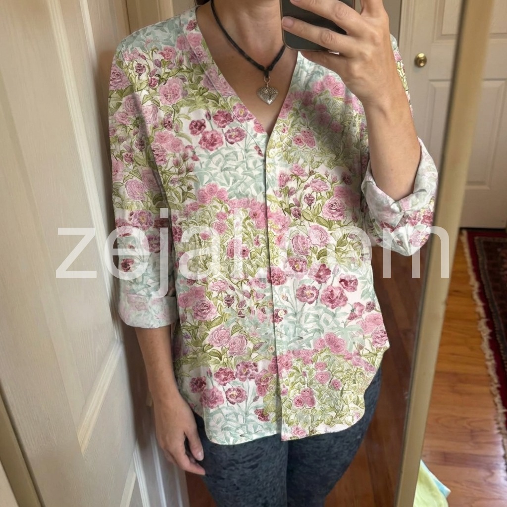 This long-sleeve top features a delicate pink rose pattern on a light background. The V-neck and button-down front add a classic touch. Lightweight fabric perfect for casual wear. Pair with jeans or skirts for a charming look. Ideal for spring and summer days.