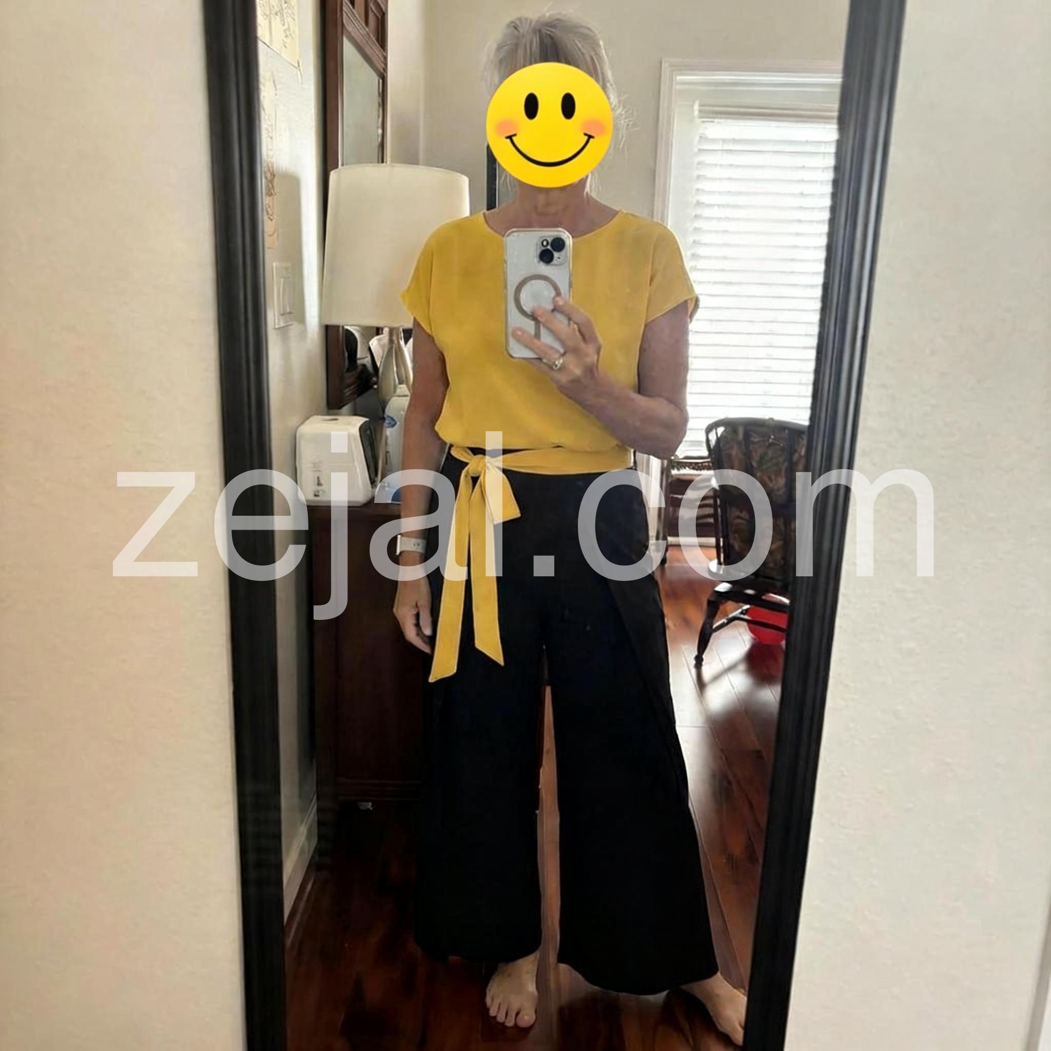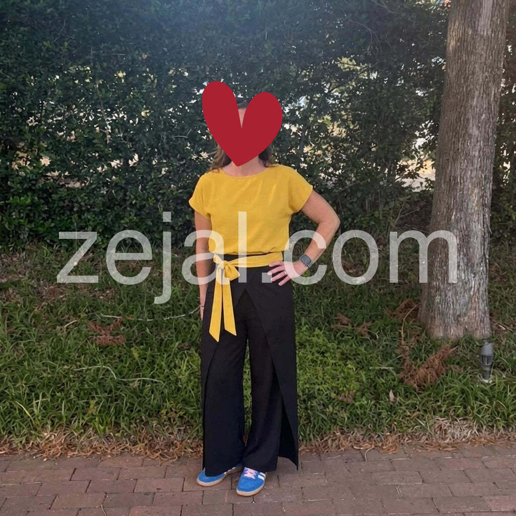I am so impressed with this outfit. The pants have this beautiful slit design that shows a peek of yellow when you walk, which adds such a unique touch. The material is lightweight and breathable, making it perfect for summer office days or weekend brunches.